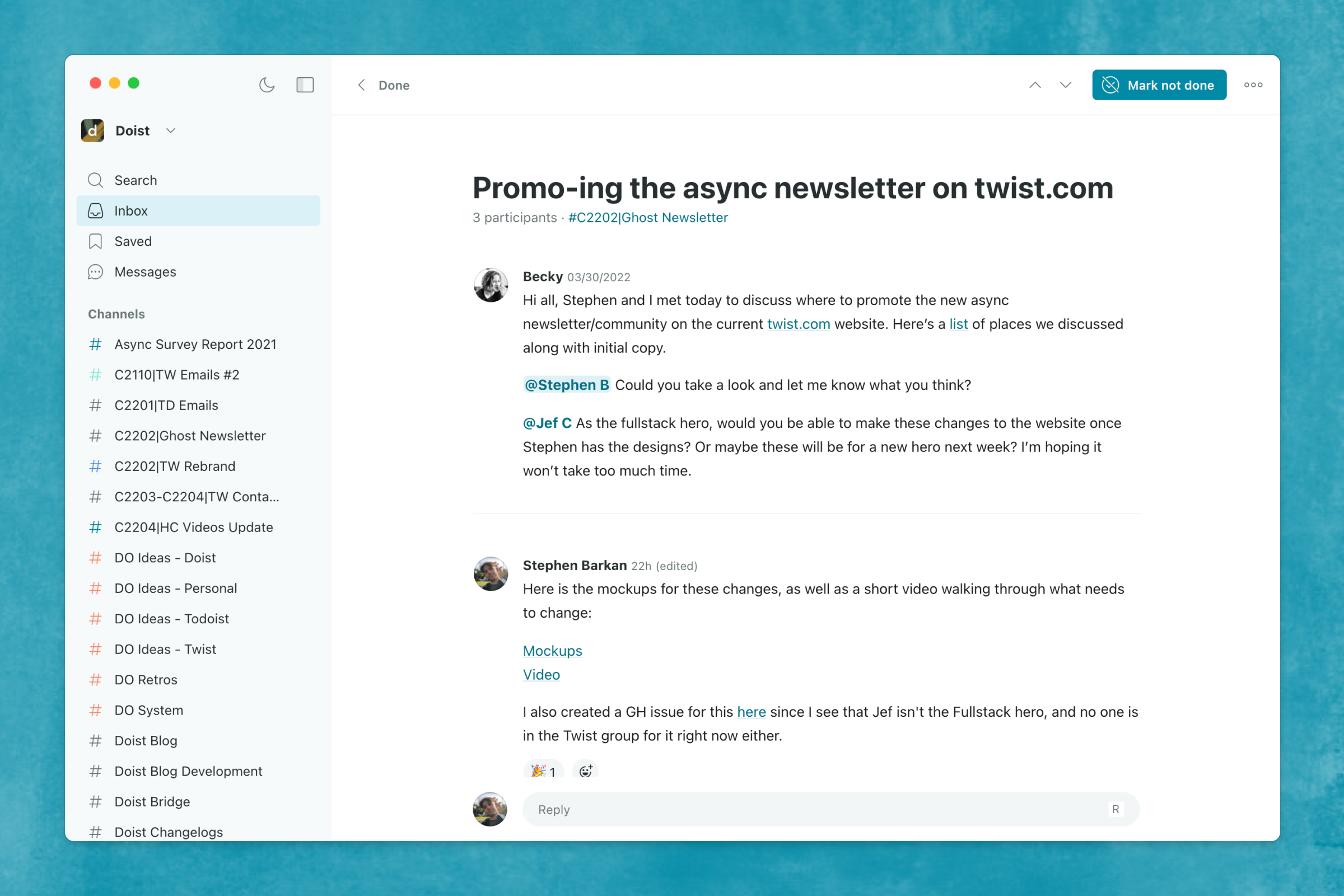 From day one, we designed Twist to make asynchronous communication the default. For example, conversations are organized into threads, keeping team discussions on topic and in context. Forever. That means you can truly disconnect to focus on deep work, or enjoy your evening, and your conversations won't be buried in chitchat by the time you get back.