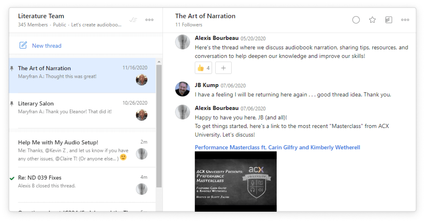 - Providing feedback in dedicated threads: A “Performance Feedback” thread enables volunteers to ask for comments on their narration of an audiobook. While Learning Ally staff doesn’t have the time to listen to entire audiobooks and take detailed notes, they want to make sure volunteers know they’re available to answer specific questions that come up or provide resources to help narrators grow their skills in particular areas.