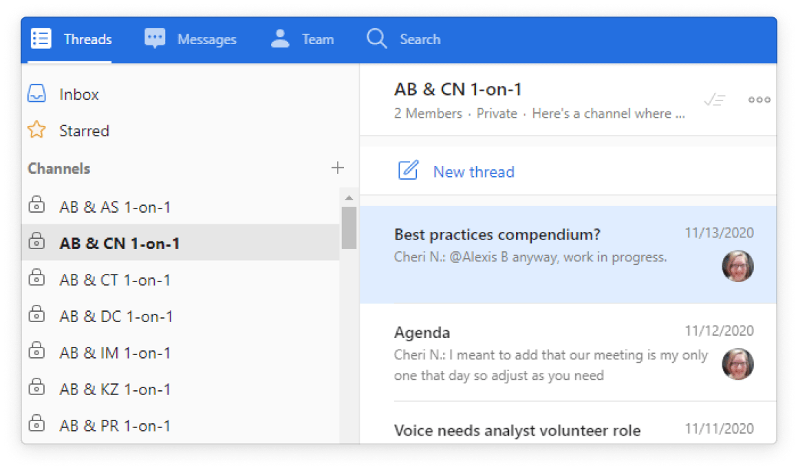 Twist has also helped Alexis coordinate meetings with his staff, a challenge of distributed work. The team stays in touch through the app when getting a meeting on a calendar is hard, with a 1-on-1 channel Alexis created for each of the six people he supervises.
