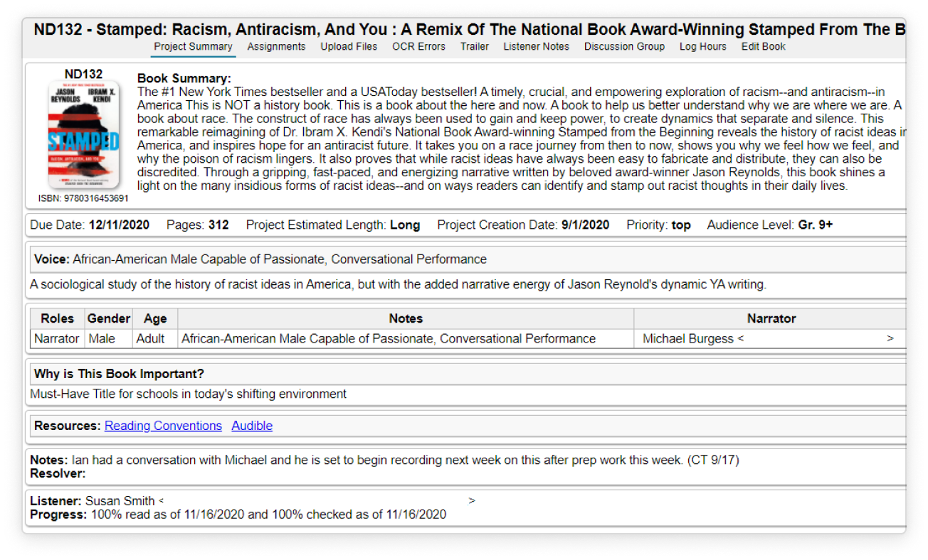 Creating one audiobook is a multi-step process that involves training a narrator, receiving the narrator’s audio files, and making changes based on the feedback of the proofer. With hundreds of volunteers creating over 1,000 audiobooks each year, it’s a huge project management effort.