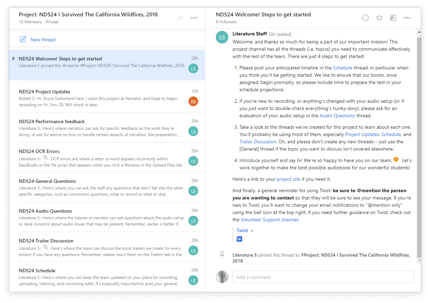 - Embracing asynchronous communication: Twist’s design intentionally encourages users not to feel like they must respond immediately to messages. Threads keep conversations organized and accessible over time allowing volunteers to communicate on their schedules and creating the calm environment necessary for recording high quality audiobooks.