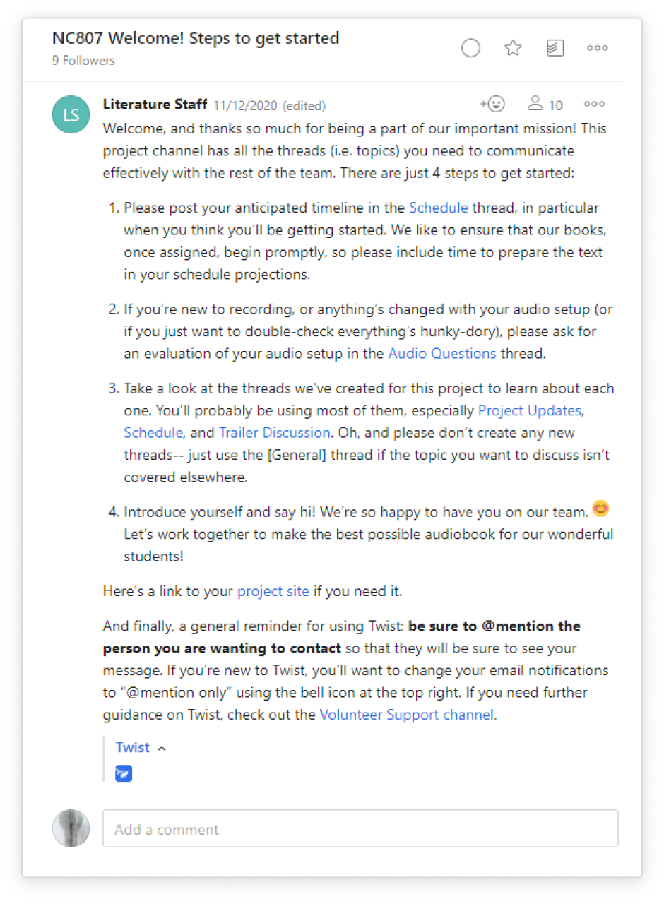 - Creating a channel with pre-populated threads for each audiobook: Channels organize messages around a broad topic, in this case the audiobook being produced. Learning Ally organizes each audiobook channel into eight standard threads based on the most common types of conversations that come up in the recording process. The volunteer working on the audiobook is directed to start by reading the pinned thread called “Welcome and steps to getting started.” This orients them on how to ask questions in Twist and begin the audiobook recording process.