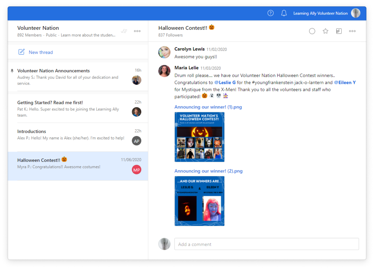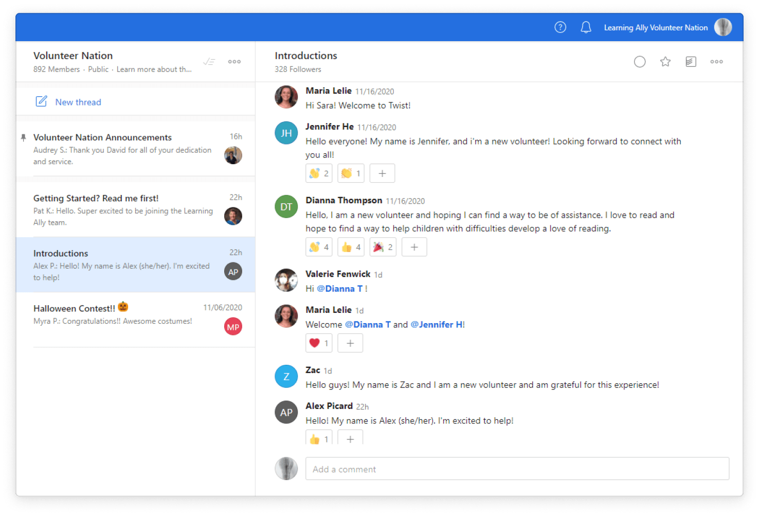 When they used Google Hangouts, some volunteers were chattier than others. Twist makes it easy for people to engage as much or as little as they’d like. Learning Ally has created threads for topics of conversation like pets, travel, food, and Halloween costume contests, so volunteers who want to be social have somewhere to go, while volunteers who may not have the same amount of time can simply ignore the threads.