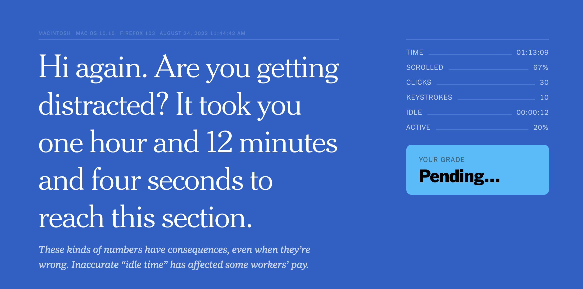 I was reminded of that experience recently while reading the New York Times’ interactive feature “The Rise of the Worker Productivity Score.” The report explores the extent to which employee monitoring software has crept into the modern workplace, keeping tabs on all types of workers — from Amazon warehouse employees and UPS drivers to social workers and therapists to lawyers, research analysts, and product managers.