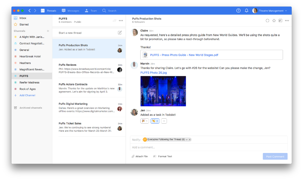“The other great thing about threads is that we can come back to conversations, which we regularly do. We started a conversation about how our ticket sales are looking, and we’ve had this conversation going on for a couple of months now in Twist. Once a week we all check this one thread that still exists and we can comment, ‘Oh, I see we said this, this week it looks like our sales are increasing’. We can take these action steps as a result.”